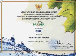 Penghargaan Program Penilaian Peringkat KinerjaPerusahaan Dalam Pengelolaan Lingkungan HidupPROPER peringkat BIRU Kepada Rumah Sakit Jakarta,Periode 2011–2012
