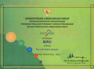 Penghargaan Program Penilaian Peringkat KinerjaPerusahaan Dalam Pengelolaan Lingkungan HidupPROPER peringkat BIRU Kepada Rumah Sakit Jakarta,Periode 2012–2013
