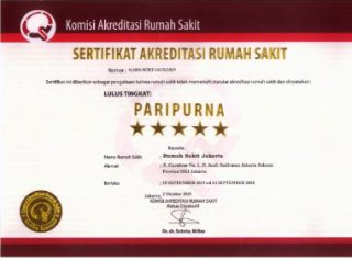 Sertifikat Akreditasi Rumah Sakit Nomor:KARS–SERT/141/X/2015Sertifikat ini diberikan sebagai pengakuan bahwa Rumah Sakit Jakartatelah memenuhi standar akreditasi rumah sakit dan dinyatakan lulus tingkatPARIPURNA BINTANG LIMABerlaku dari 15 September 2015 –14 September 2018