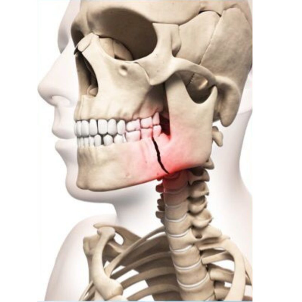 Trauma mandibula, terjadinya kerusakan atau terputusnya kontinuitas tulang rahang bawah. Hal ini dapat terjadi di beberapa lokasi sekunder dengan bentuk U-rahang dan leher condylar lemah. Fraktur sering terjadi bilateral di lokasi terpisah dari lokasi trauma langsung. Patah tulang alveolar: Ini dapat terjadi dalam isolasi dari kekuatan rendah energilangsung atau dapat hasil dari perpanjangan garis fraktur melalui bagian alveolar rahang atas atau rahang bawah.